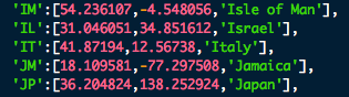 When we wanted to plot this onto Google Maps we needed to convert country-codes to Lat/Lon (map coordinates) and apparently there isn’t such a simple mapping. One reason may be that a country like France has a political border which is well defined but there’s no real point on the map that defines it, that’s pretty arbitrary. A bunch of companies (Google, Yahoo, etc) have what’s called Geocoders which are pieces of software that will take an address and return the Lat/Lon representation of it. Most Geocoders don’t like 2-letter country-code though, bummer.
