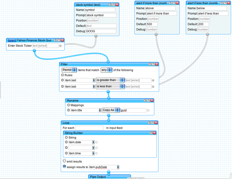 I have another pipe that does a Union bewtween my Twitter replies, the stock alert and whatever I come up with next. This endgame Pipe is what gets SMS’d whenever it changes.
